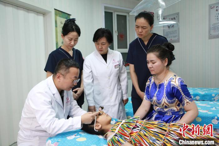 刘登教授在新疆库尔勒市妇幼保健院现场带教医务人员应用中医“亢氏疗法”技术为儿童治疗近视。(上海“中医光明行”医疗队供图)