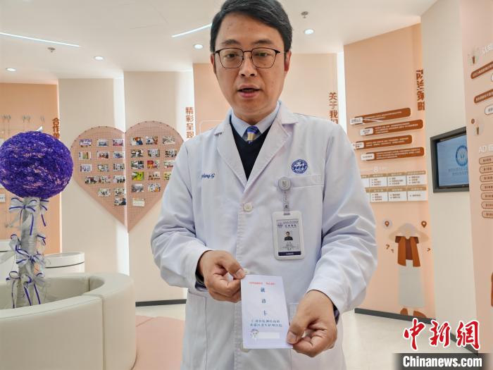 在黄浦区老年护理医院,王刚教授团队与张扬院长共同制作了就诊卡和手环。就诊卡上标明患者在使用单抗,以提醒接诊医生。(中新网记者 陈静摄)
