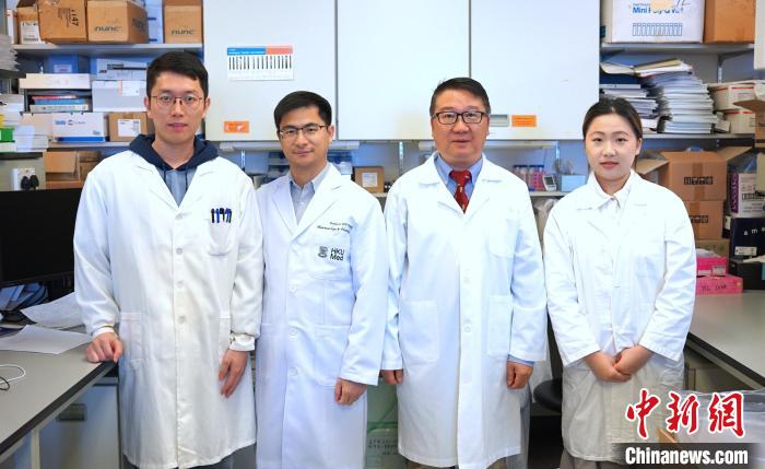 4月10日,香港大学医学院宣布,其研究团队成功开发突破性癌症免疫新疗法,名为光敏混合型γδ-T细胞外泌体,能针对并摧毁癌细胞,为癌症治疗带来突破。图为香港大学医学院临床医学学院儿童及青少年科学系教授涂文伟(右二),以及香港大学医学院药理及药剂学系、李达三博士研究中心副教授汪卫平(左二)领导的研究团队。 (香港大学供图)