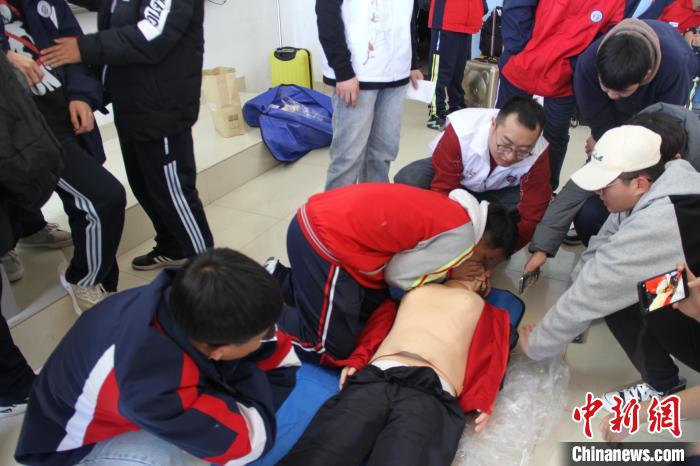 图为内蒙古医科大学附属医院青年志愿者服务队进校园,王坤(左三)教学生心肺复苏急救方法。 内蒙古医科大学附属医院供图