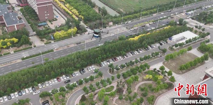 搭载模拟急救血液的无人机在飞行途中。(天津医科大学肿瘤医院 供图)
