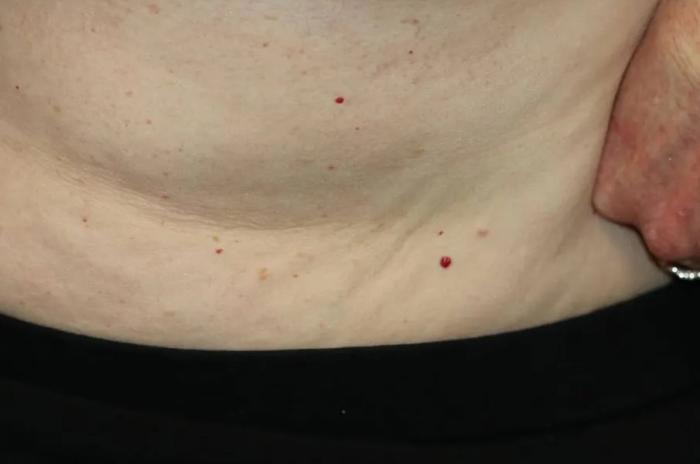 还有一个值得说的一个现象,是皮肤长红痣,也就是散在的小红点,就像下图这样。