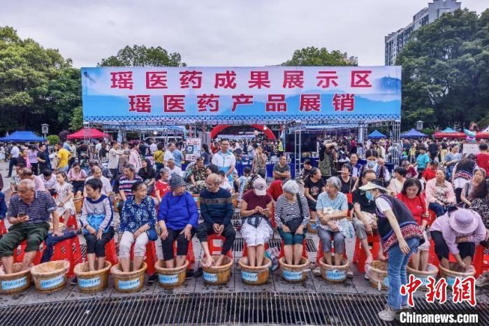 在瑶医药健康服务区,来自湖南中医药大学中医学院、湖南中医药大学第二附属医院、湖南省中西医结合医院、湖南永州市中医医院、湖南江华人民医院、江华民族中医医院、江华瑶医药研究所等单位的专家集体“出摊”,为群众望闻问切,定制健康方案。