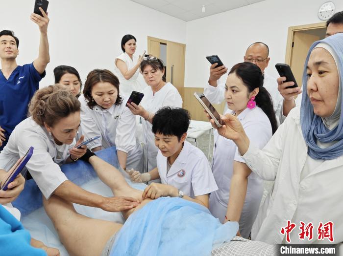 学员阿依古丽是阿斯塔纳市政府运动医学医院一名从业30年的康复治疗师及正骨医师,2023年,她跨越千里来到中国陕西,在西安中医脑病医院参加了培训班,感受到了中医的疗效。在分组实操环节,阿依古丽请求老师在她的腿部进行治疗演示,方便切身感受针尖下的力学平衡奥秘。