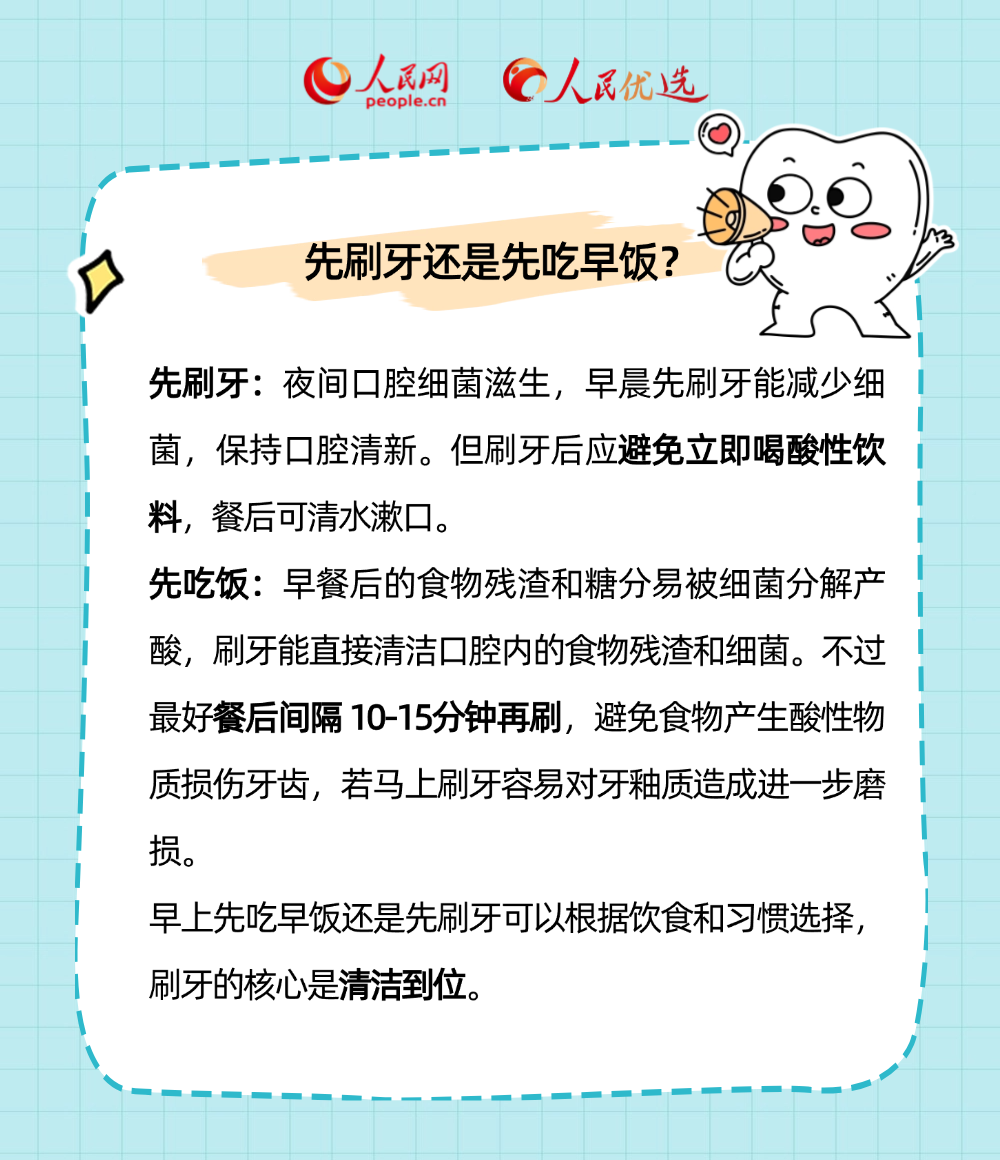关于这个问题,中国口腔清洁护理用品工业协会科技委副主任委员陈敏珊说:先刷牙和先吃早饭,都是可以的。