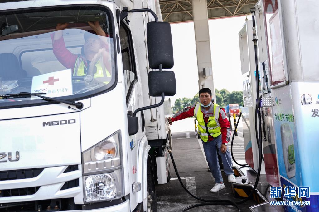 7月22日,在运送疫苗途中,司机芦艳会在加油站给车加油。新华社记者 彭子洋 摄
