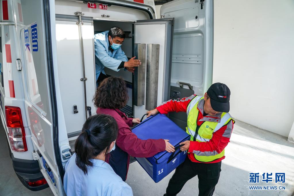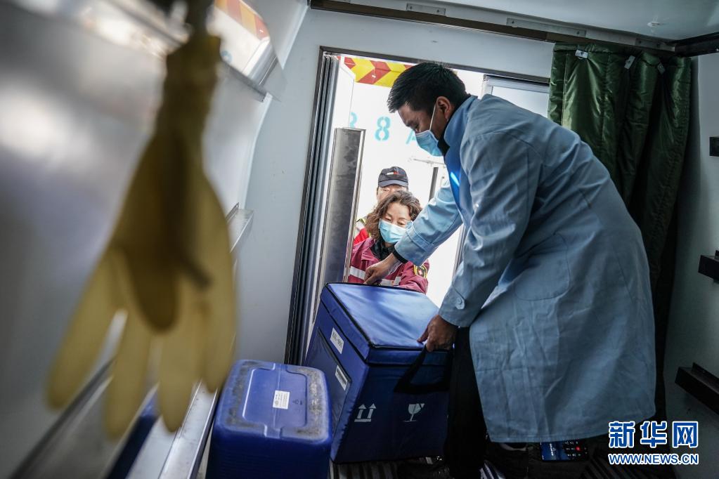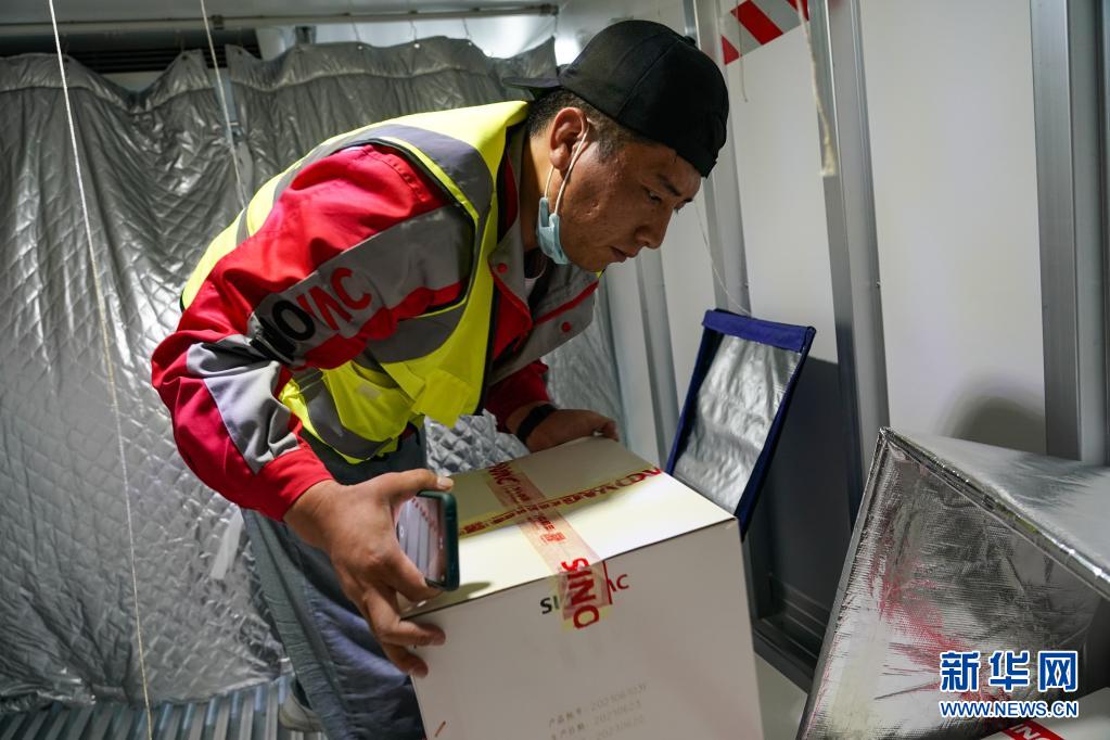7月22日,芦艳会在冷链车内将疫苗搬出,准备交付给四川甘孜州疾控中心。新华社记者 陈钟昊 摄