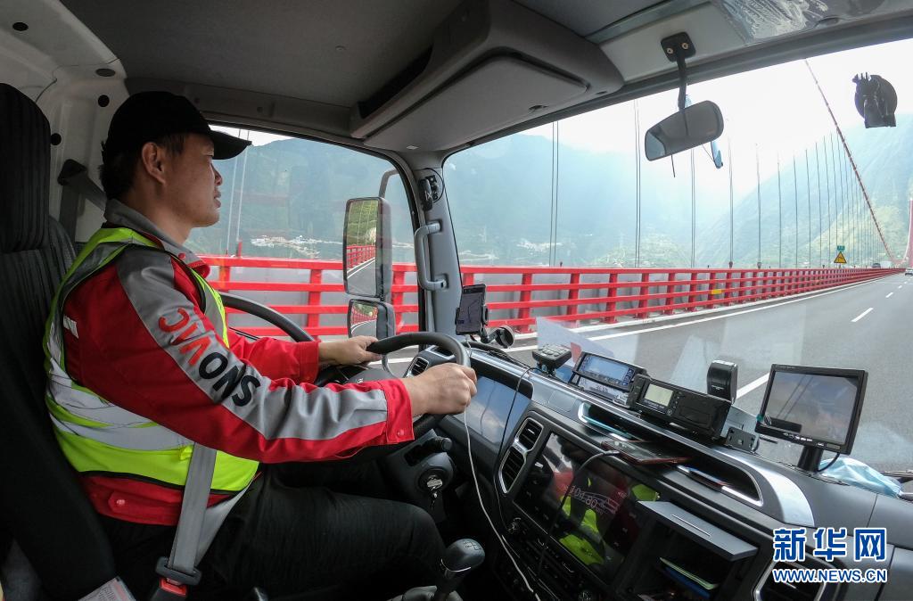 7月22日,司机刘思驾驶运送疫苗的冷链车经过大渡河。新华社记者 彭子洋 摄