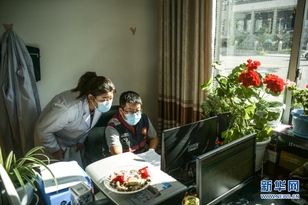 7月23日,四川甘孜州疾控中心工作人员黄亮(右)在稻城县疾控中心与当地工作人员对接疫苗信息。新华社记者 彭子洋 摄