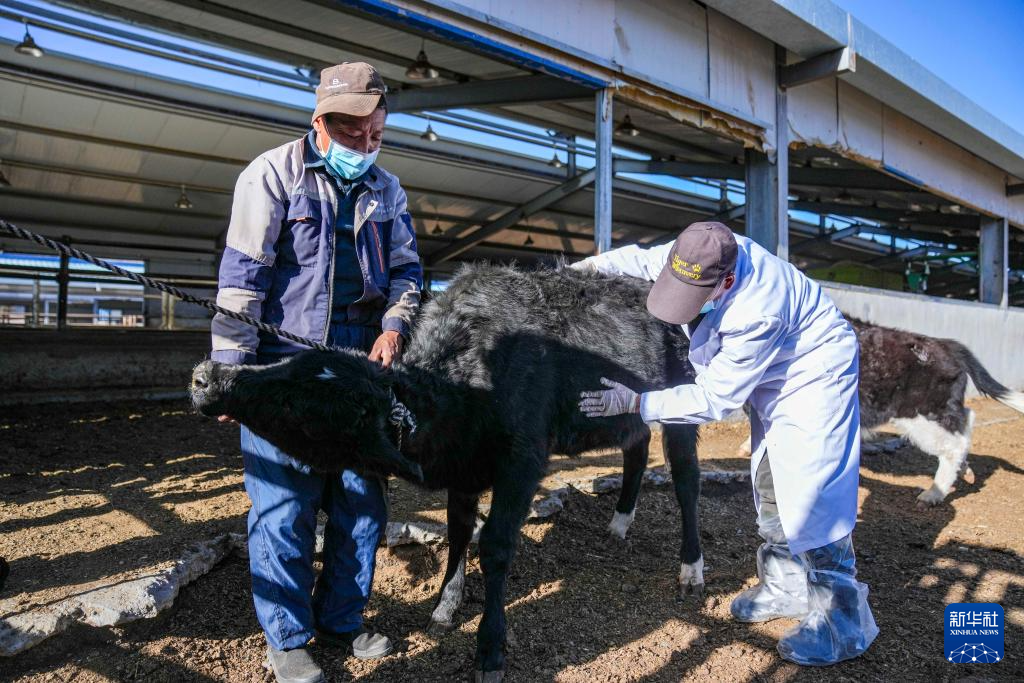 12月3日,西藏自治区动物疫病预防控制中心(区畜牧总站)曲水实验站的工作人员在检查克隆樟木牛母犊的身体状况。新华社记者 丁增尼达 摄