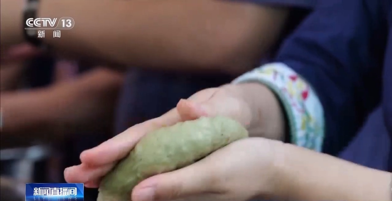 加入新鲜石斛汁液的糯米饭变得又香又糯,在一双双巧手里变成一张张绿色饼皮,包上豆沙馅料,外面再裹上香脆的苏子,一个糯香四溢的石斛霜降粑就做好了。