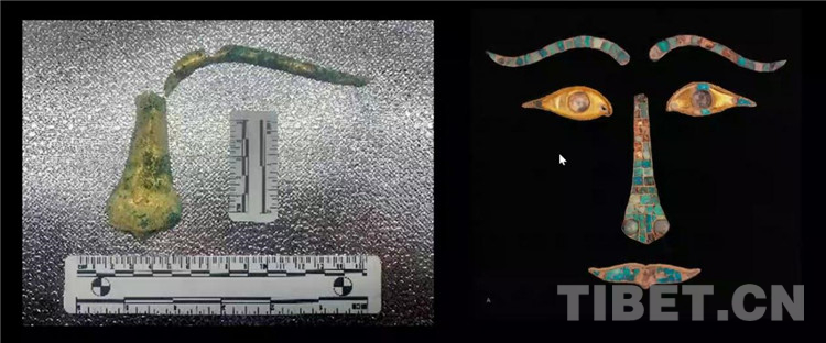 图为西藏当雄吐蕃墓地出土面具残件与青海都兰热水墓群“2018血渭一号墓”出土面具