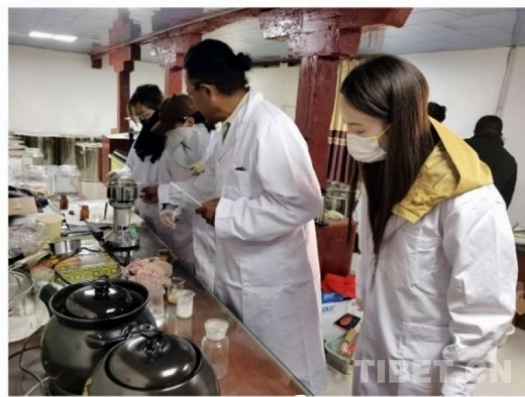 图为2021年,西藏民族大学实习生在布达拉宫古籍修复室学习制作经卷文物修复材料