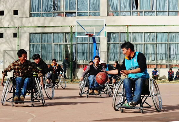 图为2015年西藏首个残疾人篮球队在练球。