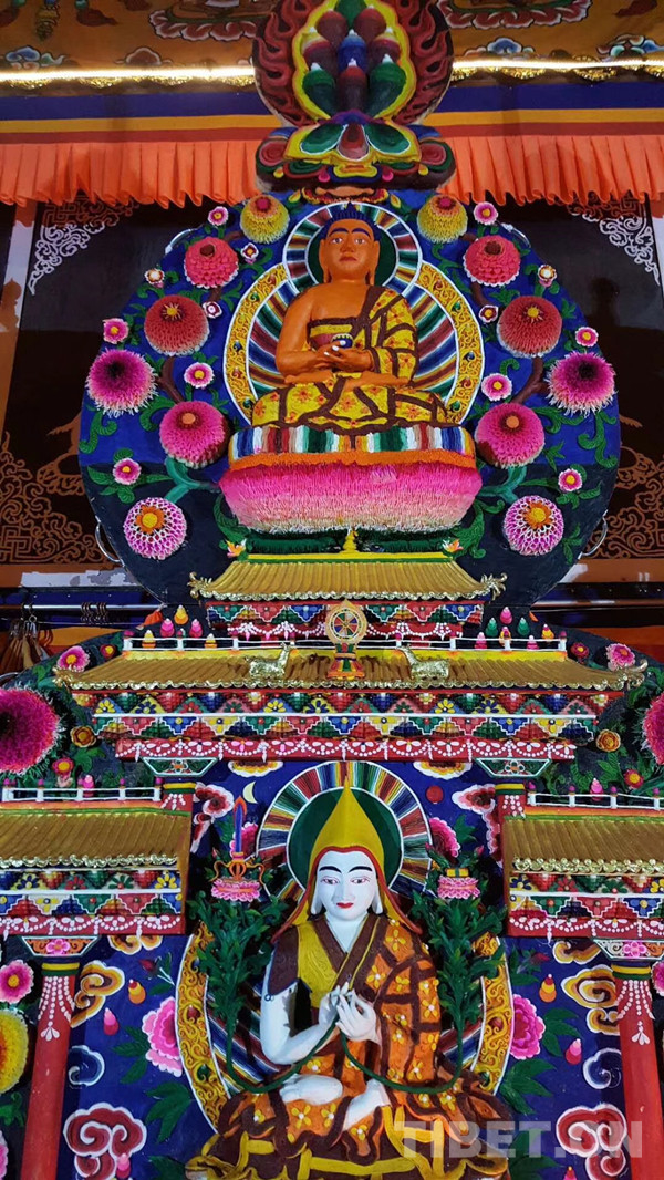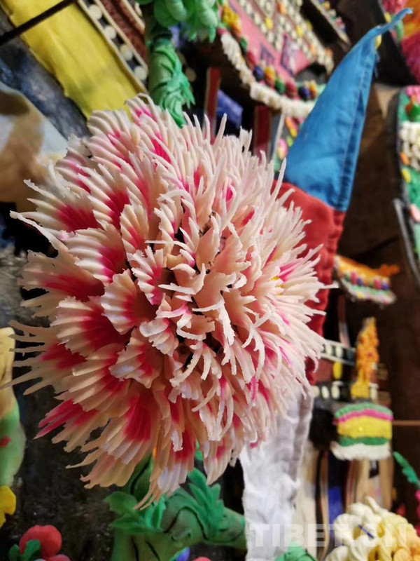 还有一种关于油酥花的传说也与文成公主有关。佛祖前供花是佛教徒表达自己虔诚信仰的一种形式,但古时藏地气候高寒,不适宜繁花生长。因此,信教群众为了表达对文成公主的爱戴以及对佛祖的敬意,纷纷供奉酥油,由艺僧制作成酥油花。图为卓尼县酥油花。