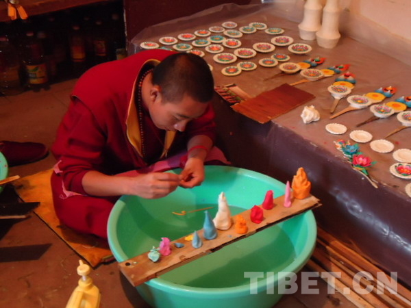 酥油花巧夺天工绚烂夺目,但制作起来却是相当困难。僧人们将信教群众们供奉的纯净白酥油揉进各种有色矿物颜料,制成胚料。然后在寒冷的房屋中“扎骨架”。为防止制作中艺僧手上的温度将酥油融化,僧人们要时不时将手插进刺骨的雪水中降温。图为僧人制作酥油花,图片来自青海省政府门户网。