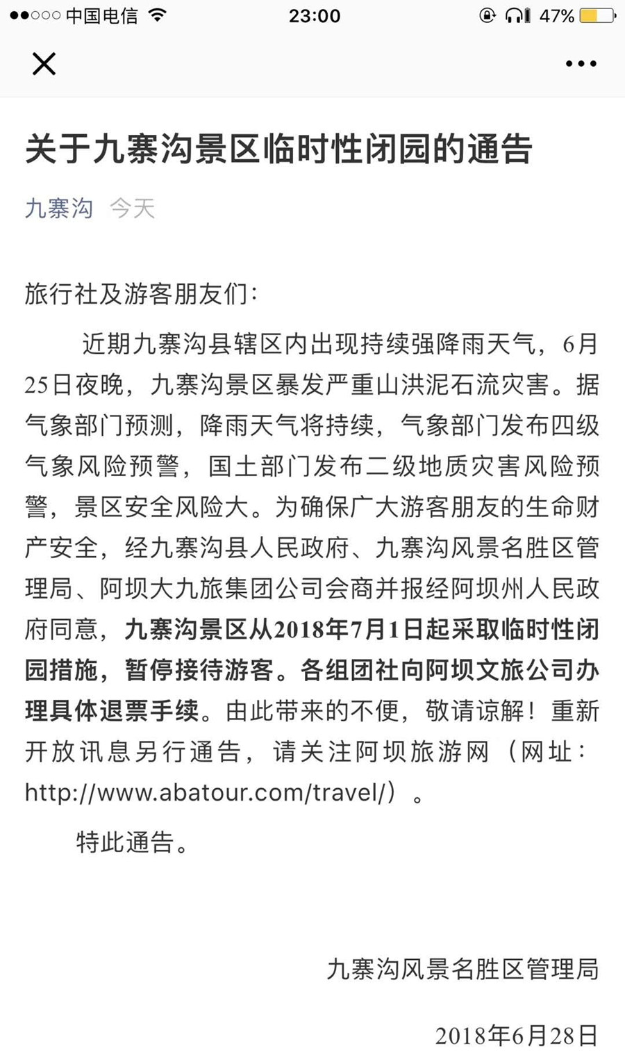 中国西藏网讯 6月28日晚,九寨沟风景名胜区管理局在其官微发布题为《关于九寨沟景区临时性闭园的通告》称,因天气原因造成景区风险大,九寨沟景区从2018年7月1日起采取临时性闭园措施,暂停接待游客。