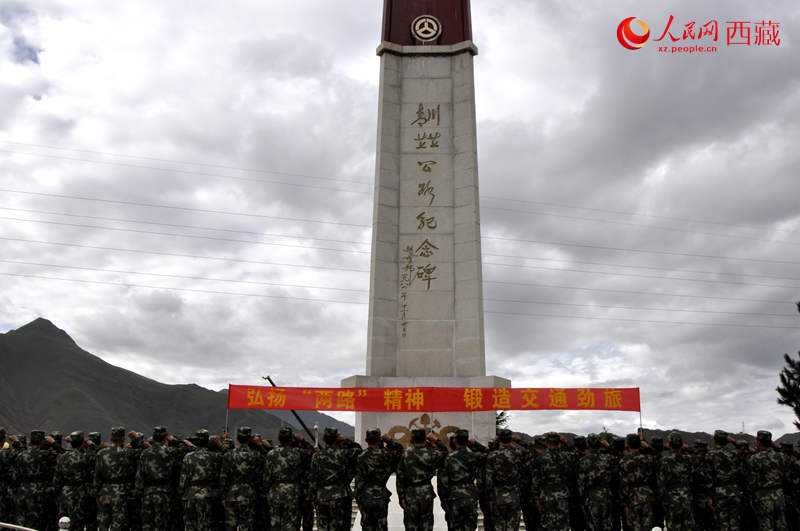 图为2014年8月9日,武警交通官兵在位于拉萨的川藏青藏公路纪念碑前宣誓,纪念川藏青藏公路通车60周年。图片来源:人民网