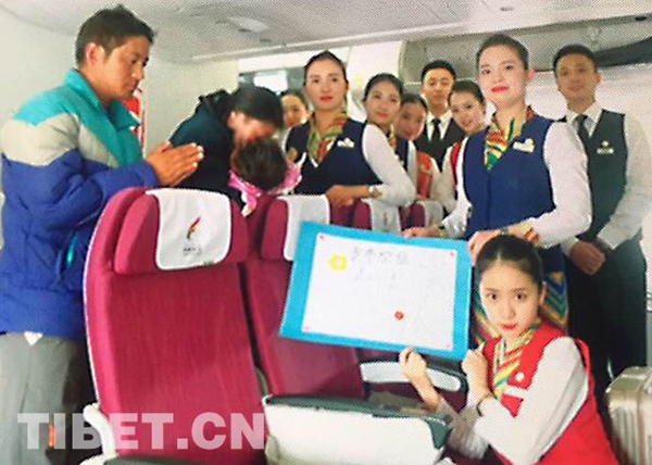 图为2017年4月30日,TV9815从拉萨到北京执飞途中,格桑花班组护送因烧伤急需赴京救治的1岁零7个月的贡布次旦一家,并为其募款。藏航供图