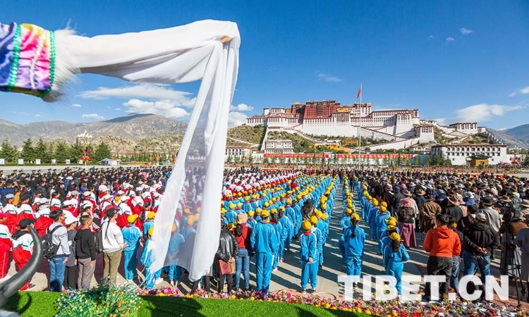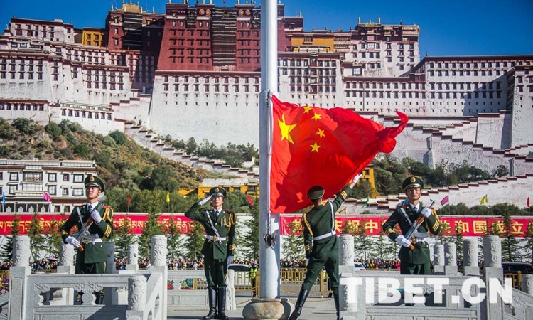 上午10时,伴随着《义勇军进行曲》,五星红旗在各族群众的齐声歌唱中缓缓升起。飘扬的五星红旗下,雪域高原一派生机盎然的景象。在中国共产党的领导下,雪域高原的面貌日新月异,昂首阔步走在社会主义康庄大道上,处处呈现出经济发展、社会进步、文化繁荣、民生改善、民族团结、宗教和睦、人民安居乐业的喜人局面。