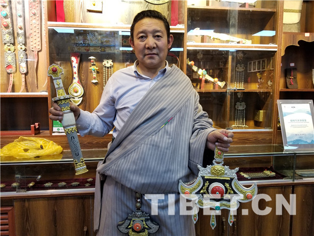 记者前年见过更求普措打制的“藏刀王”。藏刀王长约1.6米,刀鞘上镶嵌有各种珍珠玛瑙,造型美观,让人叹为观止。这次见他身着一身近似西藏管家的藏装,那发型和淡淡胡子更让感到一丝神秘。他话不多,但是展示的展品很多,最有名的还是传承自家乡称多县赛河乡阿朵村的铁器制品藏刀和火镰。