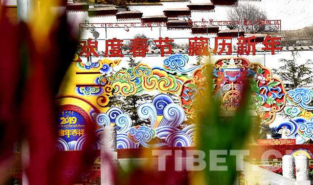 拉萨市园林局负责人介绍,3000多盆仿真花卉和4万余束红黄两色的绢花用在布达拉宫广场中心位置进行地面装饰,营造春节、藏历新年的浓厚氛围。