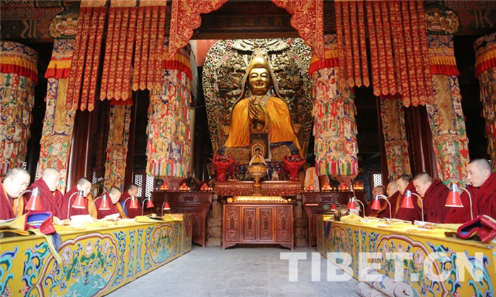 图为雍和宫僧人端坐于宗喀巴大师像两侧诵经。