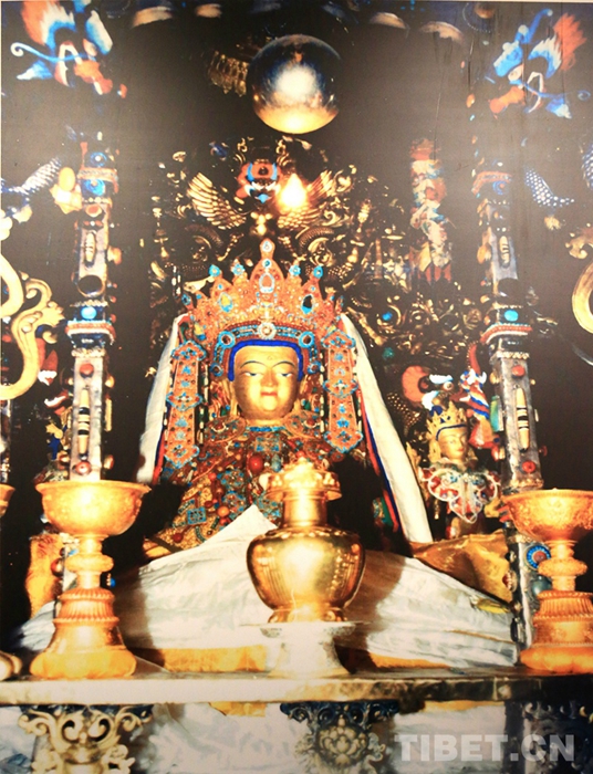 图为大昭寺释迦牟尼佛像前装有3枚灵童名签的金瓶。