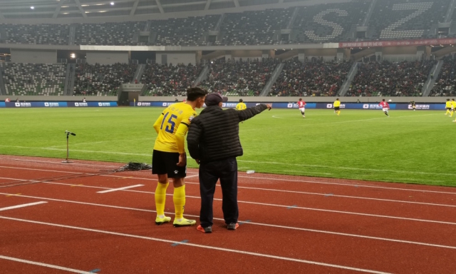 图为比赛60分钟时,主教练张彪对即将上场的次旺平措现场指导战术。