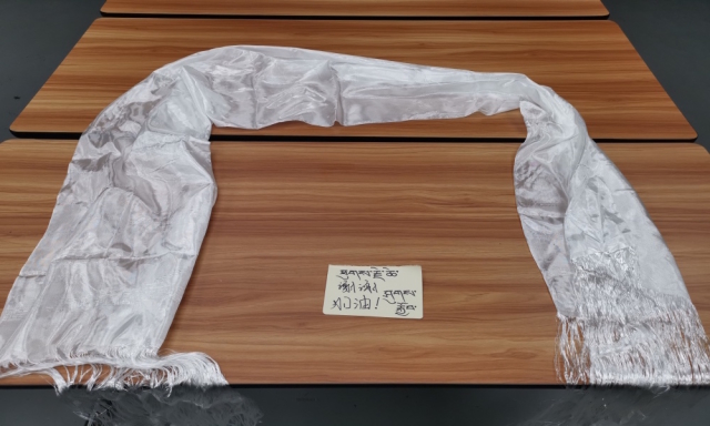 图为拉萨城投在打扫完客队休息室卫生后留下的字条和哈达。