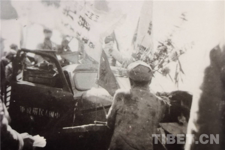 图为1950年3月27日,十八军进藏北路先遣部队的52师154团在乐山举行誓师大会,军师主要首长均到会讲话。图为154团政委杨军带领全团宣誓。