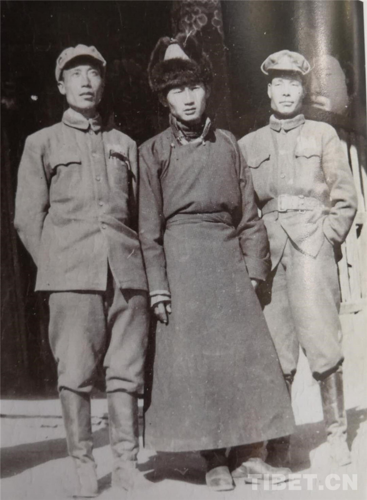 图为1951年11月18日,团长郄晋武(右)政委杨军(左)与江孜喇嘛寺白吉堪布(中)合影。