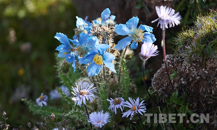 保护区内,野生动、植物资源丰富,是高原生态环境科考的圣地。图为鄂陵湖边生长的绿绒蒿和野菊 摄影:杨月云