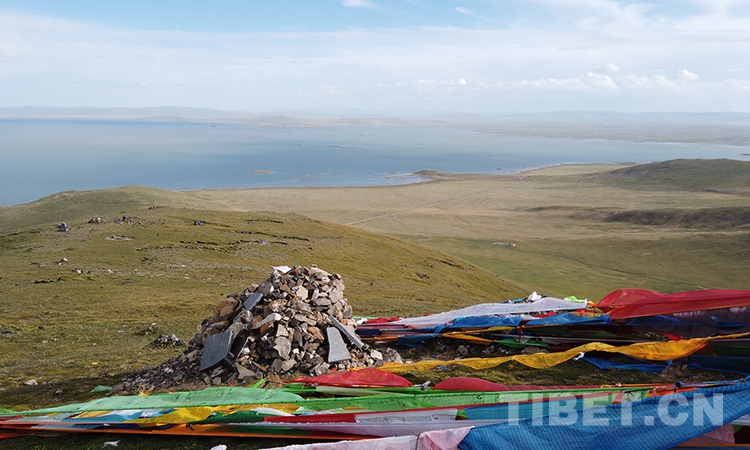 图为湖边的玛尼石堆和迎风飘扬的经幡 摄影:杨月云