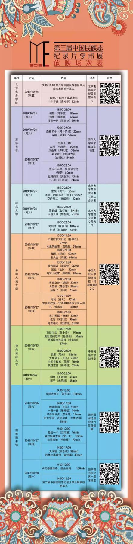为有效拓展民族志纪录片的传播对象,让参展影片得到更多的社会关注,本届影展将分别在北京大学、清华大学、中国人民大学、中央民族大学以及国家图书馆等多地举办。与此同时,主办方将邀请专家学者、知名导演对影片进行评议,并邀请纪录片作者与观影者进行交流互动,进一步强化学术交流氛围,力求以最具活力和生动的学术讨论形式,推动中国民族志纪录片进一步发展。