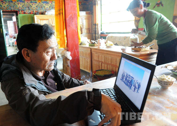 图为索朗公布从拉萨来到班戈县青龙乡姐姐家探亲时,没想到能见到来看望他的老朋友唐召明。这是索朗公布高兴地观看老朋友电脑里的图片,回忆两人30年来不寻常的友谊(唐召明2012年8月2日摄)