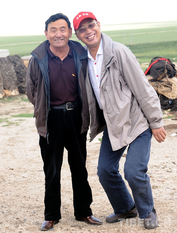 图为唐召明(右)在班戈县采访时,听说索朗公布从拉萨来到该县青龙乡姐姐家探亲,专程去看望索朗公布。两人相见甚是高兴,并合影留念 (唐召明2012年8月2日摄)