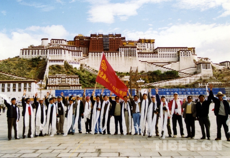 图为藏北高原无人区科考团人员在拉萨布达拉宫前挥旗出征无人区,并合影留念(唐召明2001年6月26日摄)