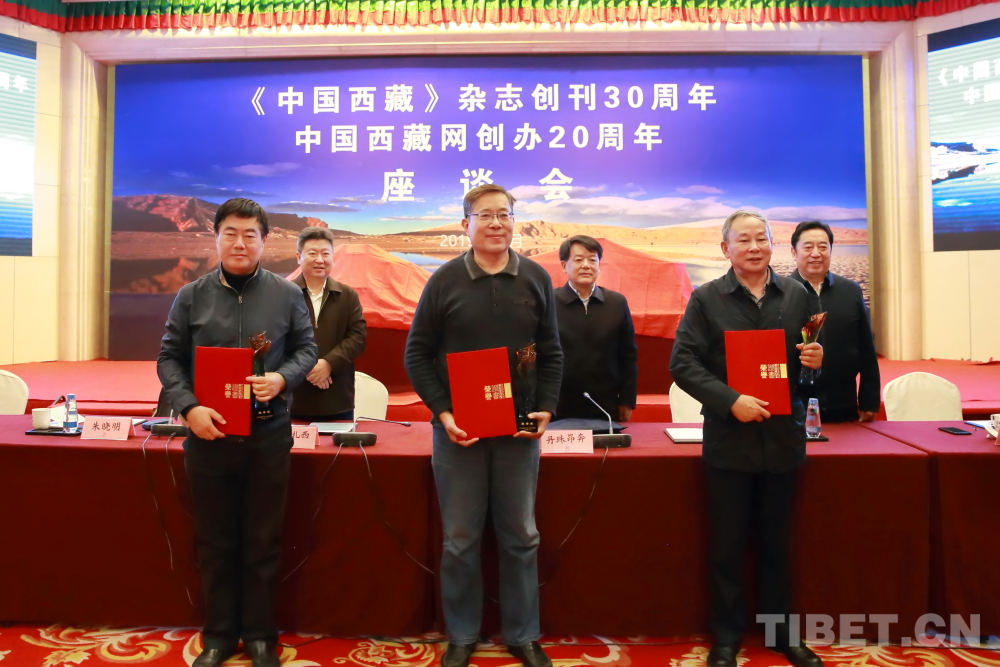 图为全国人大民族委员会副主任委员丹珠昂奔(后排中),青海省委常委、统战部部长公保扎西(后排左)、四川省政协原副主席罗布江村(后排右)为中国西藏杂志社退休老领导颁发荣誉证书