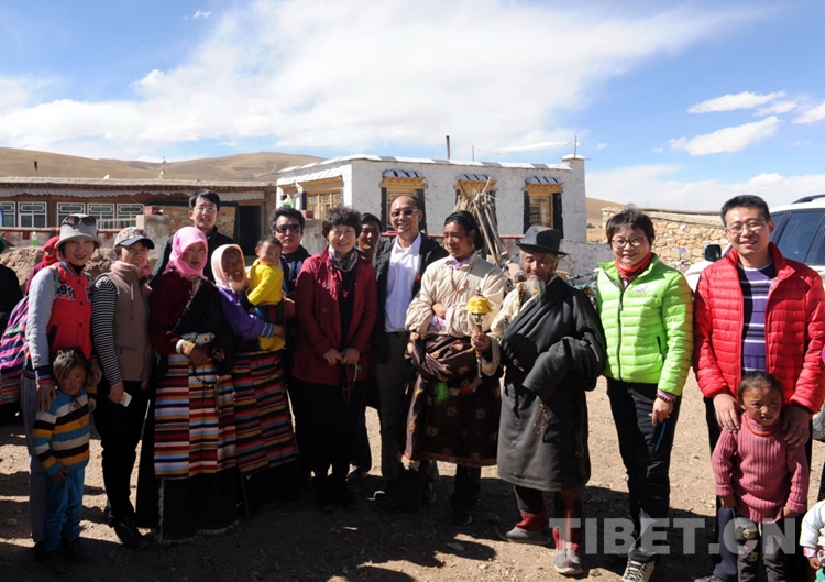 这是唐召明陪同中国评剧院艺术家和筛查先心病的北京安贞医院小儿心脏病专家顾虹,来到藏北班戈县青龙乡采风、筛查先心病,并与牧民群众合影留念。(唐召明提供,2015年10月8日摄)