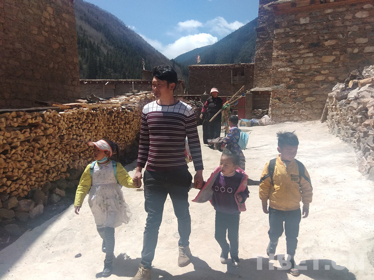 桑登同学家住离学校2公里外的安巴村,路上要经过一段茂密的森林和山崖,和桑登一样,班里还有两三位学生的家住得比较远。傍晚,蜿蜒曲折的山路上总能看到一大数小的身影,走在中间的降措左手牵一个,右手拉一个,夕阳将他们的影子愈拉愈长,直到最后只剩一个身影,这是降措将孩子们逐一安全送回家后,独自一人回去的身影。他和孩子挥挥手,转身往回走,只听门口又传来喊声,“格啦,图吉切、图吉切”(藏语:谢谢、谢谢老师),千言万语凝成一句,桑登家的克珠老人总是重复着这句话。