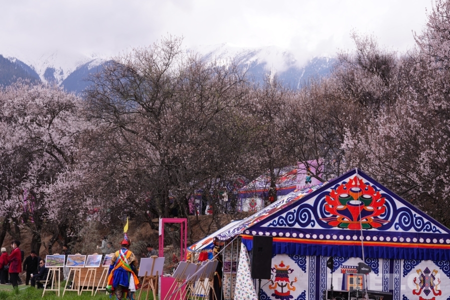 桃花树林里还搭建了很多绣有精美图案的帐篷,居民游客可以在这里体验林芝各地的民风民俗、品尝特色农畜产品、欣赏非遗文化……在林芝镇帐篷门口,国家级非遗传承人、嘎拉村村委会主任尼玛多吉穿着一身米娜羌姆服饰迎接来宾。米纳羌姆,是一种以舞蹈动作为主的民间表演艺术形式之一,距今已有1300多年的历史,2014年被列为国家级第四批非物质文化遗产名录。尼玛多吉介绍说:“米纳羌姆是每当春节、工布新年、林芝桃花节等节庆日必不可少的演出节目,表演者皆为男性,在我们这里大人小孩都能跳。”