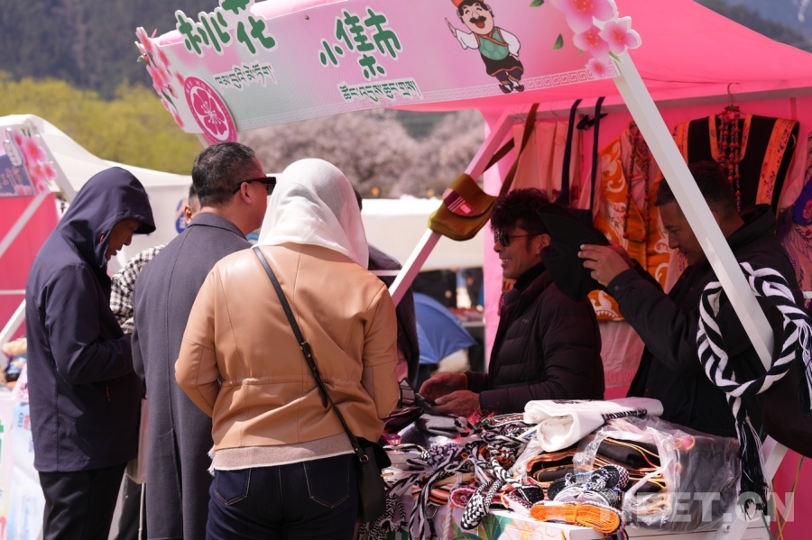 沿着蜿蜒的小路,一边是错落有致的桃花树,一边是特色集市。“这些是工布男女服饰、这是马套、这是藏式包包……都是我们合作社的工作人员手工制作的。”在舞台一旁的桃花小集市,林芝市巴宜区丝绸藏装定制农牧民专业合作社负责人尼玛扎西正向游客一一介绍自家展销点的产品以及其背后的文化和制作过程。经过一番讨价还价,一千余元的“大单子”顺利成交,游客将一件件精美的巴宜“小礼品”装进袋子和尼玛扎西挥手告别。