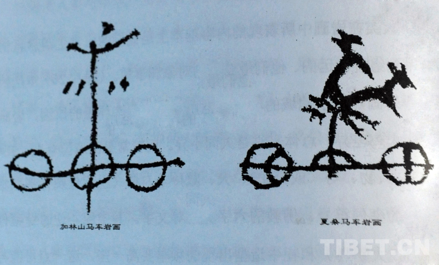 图为加林山俄东沟里的马车岩画(左)与尼玛县岗龙乡夏桑马车岩画(右)的手绘图(唐召明2001年摄)