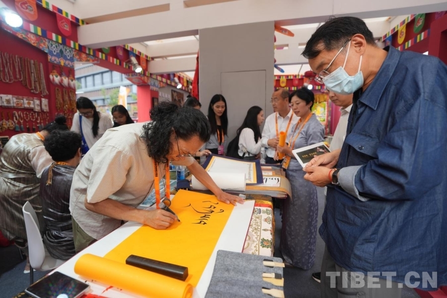 图为现场观众体验藏族书法、唐卡、藏香等文化