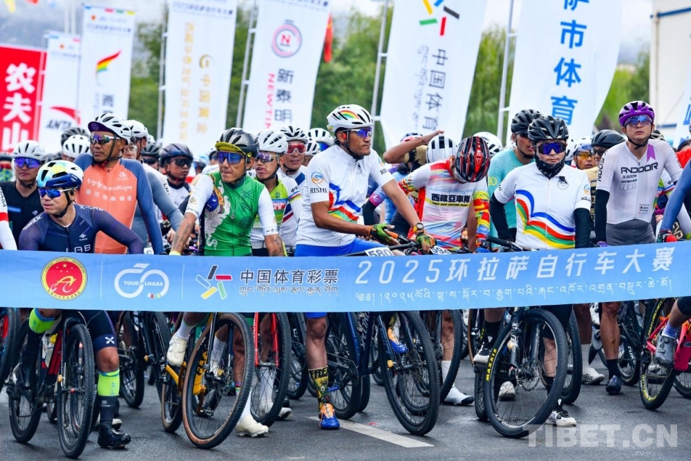 图为2025环拉萨自行车大赛等待发令的参赛运动员们 摄影:赵振宇