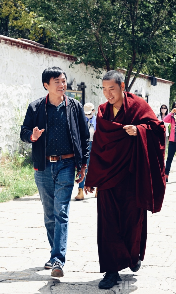 图为沈卫荣(左)与色拉寺僧人交谈 图片由受访者提供