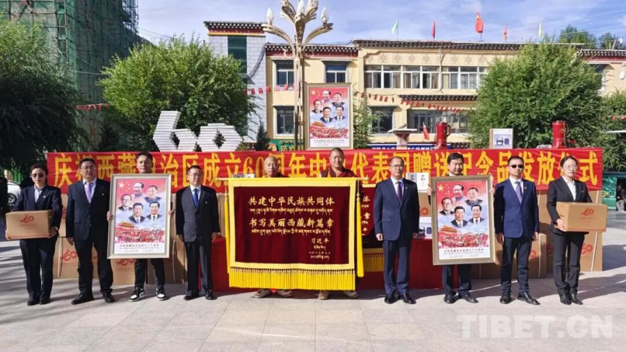 在仪式现场,干部代表为11乡(镇)代表发放了中央代表团赠送的领袖画像、全自动酥油茶壶,为孜托寺发放了“共建中华民族共同体 书写美丽西藏新篇章”贺幛。