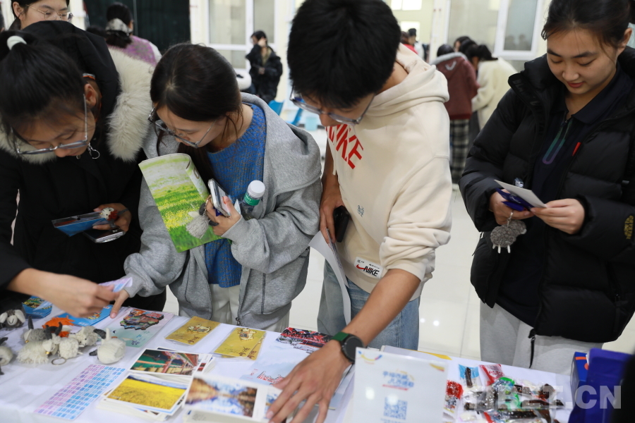图为活动现场同学们领取西藏相关明信片、手工文创及杂志。摄影:毕然