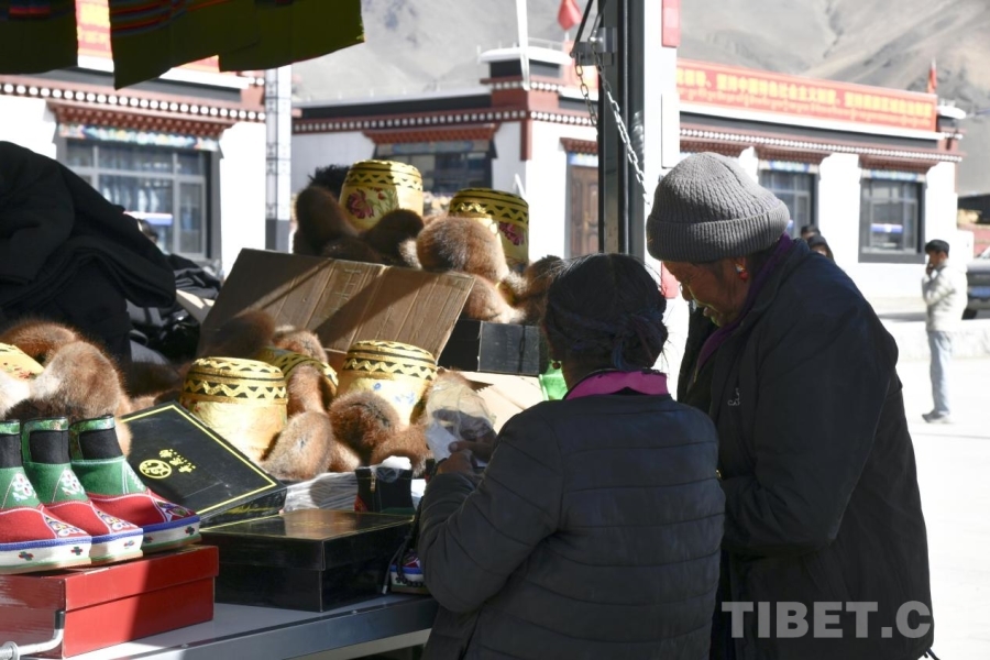 图为日喀则农事新年即将来临,定日县长所乡森嘎村老人在集市上挑选新装。摄影:赵振宇